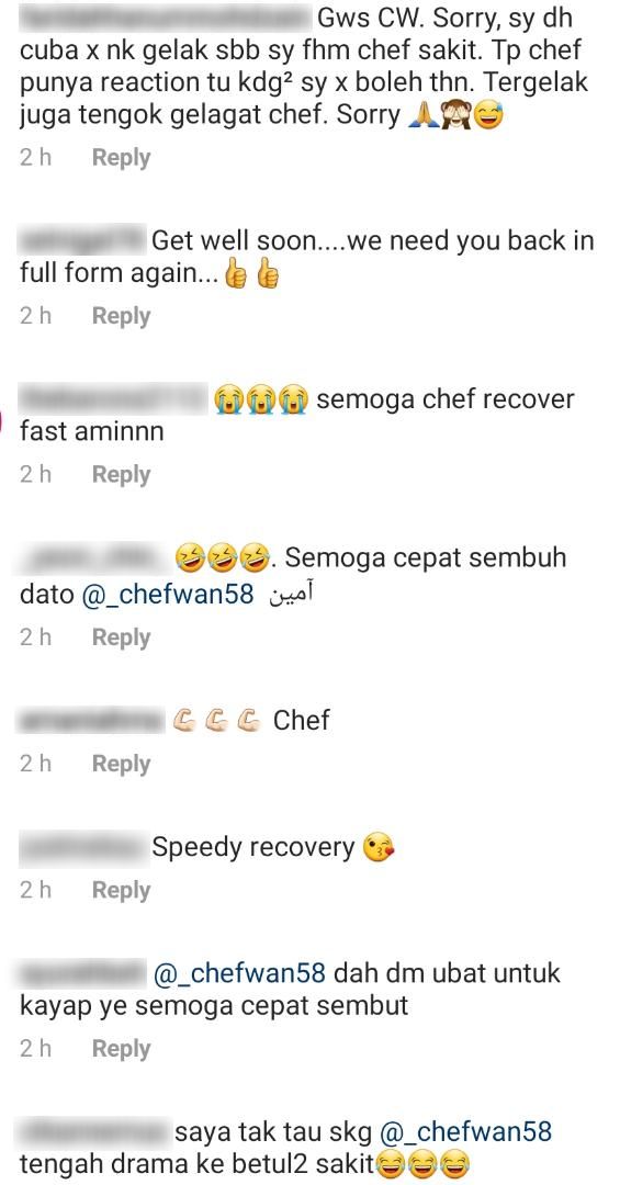 Meskipun aksi yang dibuat oleh Datuk Chef Wan nampak melucukan, namun proses itu sememangnya sangat menyakitkan. Turut bersimpati dengan masalah kesihatan yang sedang ditanggung oleh tukang masak popular itu, netizen di ruangan komen mendoakan kesihatannya selain memberi beberapa petua perubatan lain bagi tujuan merawat kayap.